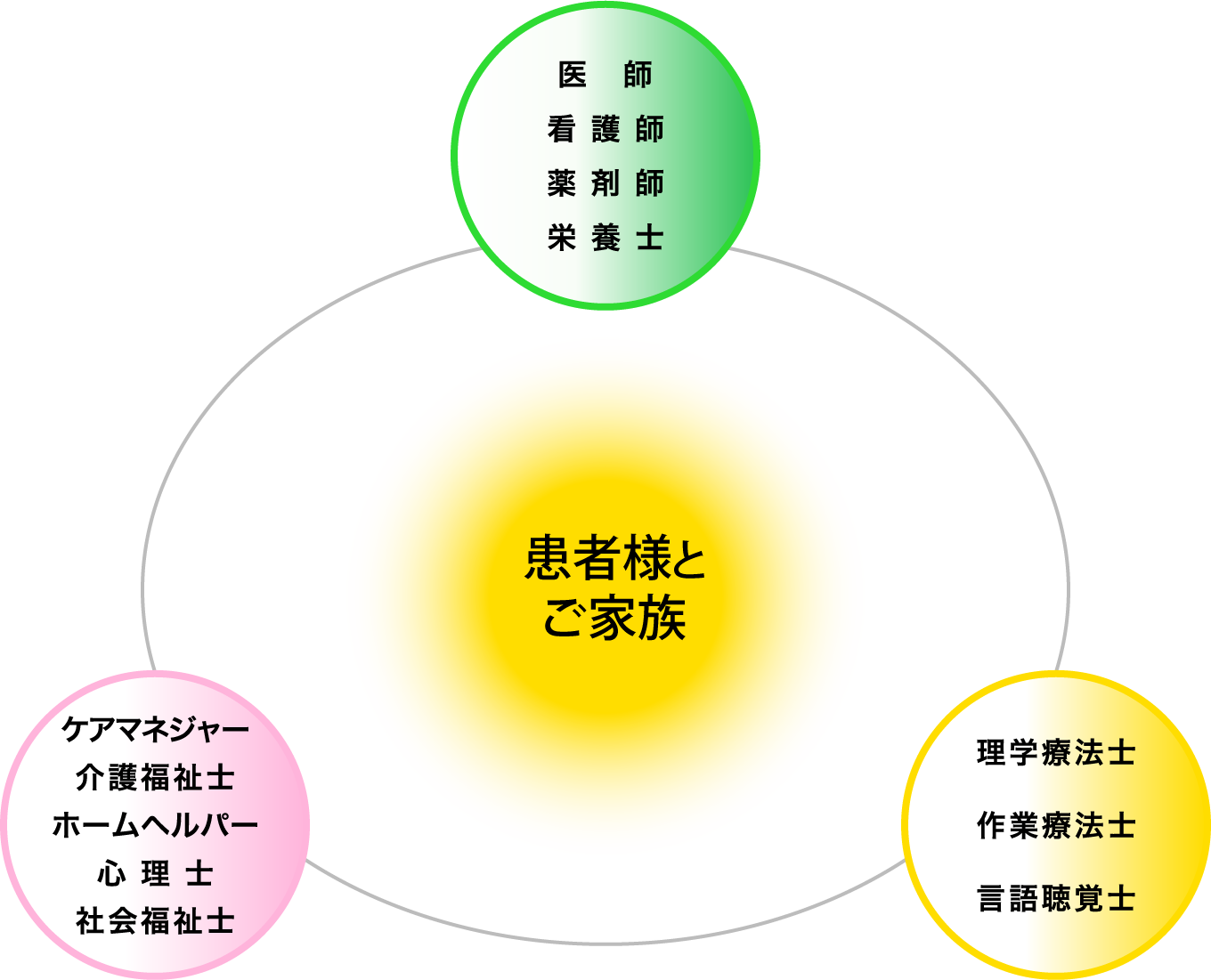患者様とそのご家族を中心に医師をはじめ、さまざまな医療スタッフが患者様の支援をいたします。