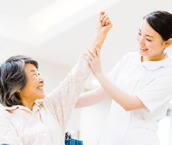 起床から就寝時まで、できるだけベッドから離れて、「廊下を歩く」「食事をとる」「トイレに行く」「お風呂に入る」などの日常生活に必要な動作ができるように、患者さま一人一人にリハビリテーションを提供していきます。