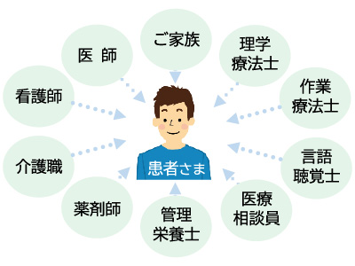 医師や病棟専属のリハビリスタッフ、看護師、医療相談員など多くの専門職がひとつのチームを形成します。