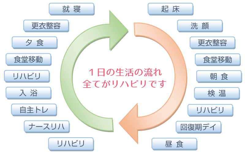 起床から就寝時まで、できるだけベッドから離れて、「廊下を歩く」「食事をとる」「トイレに行く」「お風呂に入る」などの日常生活に必要な動作ができるように、患者さま一人一人にリハビリテーションを提供していきます。