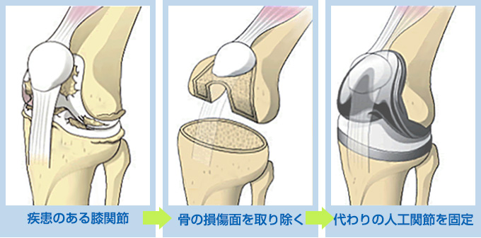 手術方法は、人工膝関節置換術がもっとも効果的で、長期成績も安定しています。 人工膝関節置換術には、全部取り換える全置換術と、悪い方の内側の軟骨だけ取り換える単顆型置換術がありますが、どちらの方がふさわしいかの判断は専門の医師の判断に任せた方がよいでしょう。