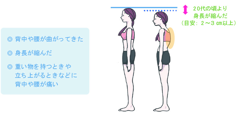 これらの症状が出たら、骨粗しょう症によって背骨(椎体)が「いつのまにか骨折」しているサインかもしれません。