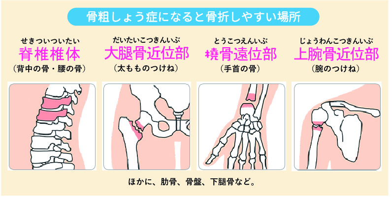 骨粗しょう症になると、つまずいて手をついた、くしゃみをした、尻もちをついた、などの「こんなことで?」と思うような少しの衝撃で骨折してしまうことがあります。好発部位は大腿骨近位部骨折や脊椎(背骨)などがあります。