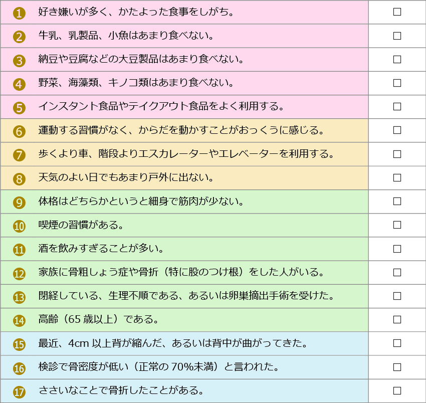あてはまる項目にチェックを入れて、自分の骨の健康度をチェックしてみましょう!
