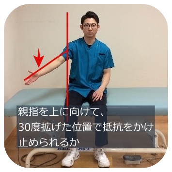・棘上筋テスト(SSPテスト)棘上筋は外転(腕を横から持ち上げる動き)で作用する筋肉です。
